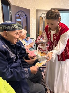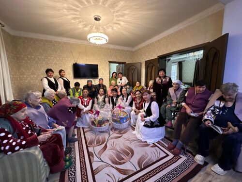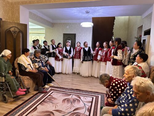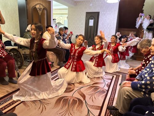 Жылы лебізден соң балабақша тәрбиешілері сүйікті әндерімен қарттардың көңілін көтеріп, өнер арқылы еткен еңбектері үшін алғыс білдірді. Қазақ биімен тамсандырып, домбыра-баянда бірлесе ән салдырып, гитараның құйқылжыған әуенінде бірге биледі. Тағдырдың жазуымен осындай шаңырақта өмір сүріп жатса да ерік-жігерін жоғалтпай, құштарлықтарын өшірмей отырған қариялар ортада би билеп, жастық шақтарына саяхат жасады. Ұжымның жарымжан қарттардың көңілін бәр сәтке шалқытып қайтайық деген адами асыл қасиеттері анық көрініп тұрды. Құр сөзбен емес, шынайы қамқорлықпен, жан жылуымен өткізілген әсерлі іс-шара болғандығы анық аңғарылды.