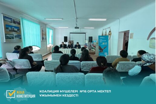 «Әділетті және Прогрессивті Қазақстанның Халықтық Конституциясы үшін!» коалициясының мүшелері Талғар ауданындағы №16 орта мектеп педагогикалық ұжымымен кездесіп, жаңа Конституция жобасының саяси реформаларын таныстырды.